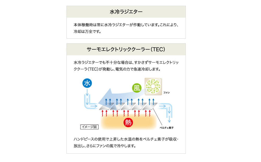通常、連続で使用すると熱が発生するため照射間隔を空ける必要性があります。しかしLUMIX-NO.V1Aならツインクーリングシステム搭載なので、安全に連続使用が出来て故障知らずの高性能マシンです。
