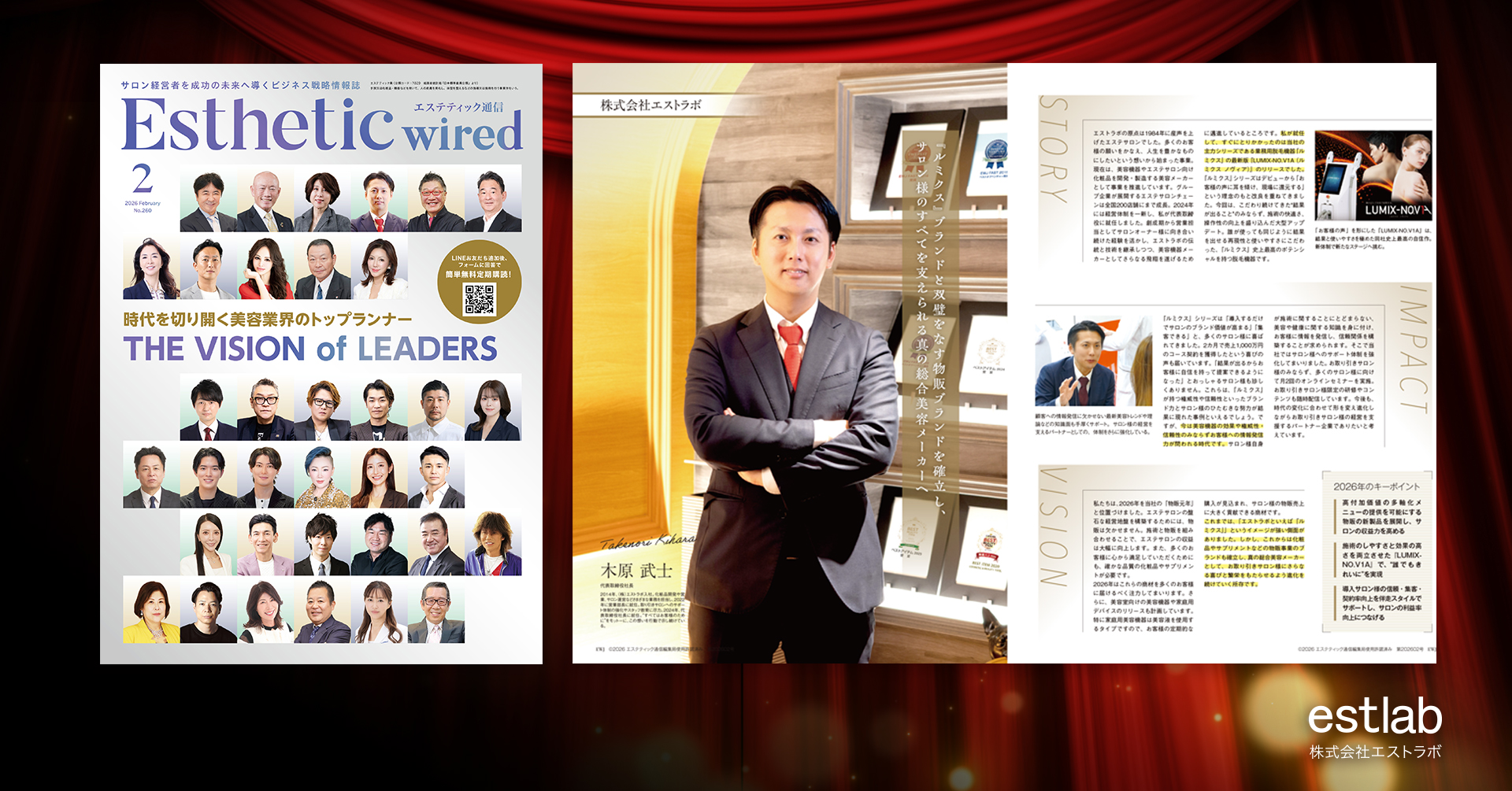 この度、株式会社美容経済新聞社が発行する経営専門情報誌『エステティック通信』2026年2月号(2026年1月10日発行) において、特集企画「時代を切り開く美容業界のトップランナー THE VISION OF LEADERS」 に、弊社代表取締役社長・木原武士が選出・掲載されました。